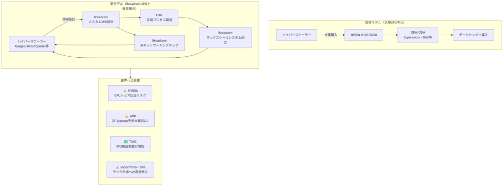 カスタムXPUの設計支援、高速ネットワーキングチップ、そしてラックスケールシステムという三層構造で垂直統合を深めるBroadcomの戦略は、「NVIDIAのように自社ブランドで目立つ必要はない、インフラの血管として存在し続ければよい」 という哲学を体現しています。