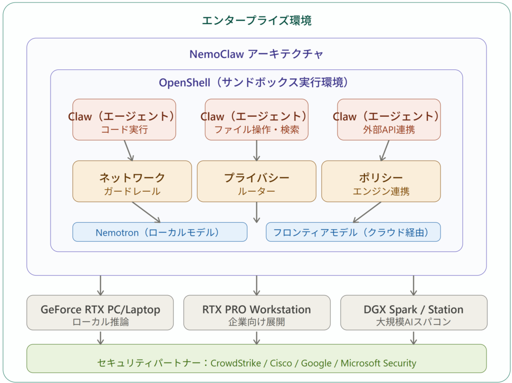 OpenShellはNVIDIAのAgent Toolkitに組み込まれた新機能で、サンドボックス環境においてエージェント(”claws”と呼ばれる)の動作範囲を制限します。NemoClawはNVIDIAのNemotronモデルをはじめ任意のオープンモデルを利用でき、GeForce RTX PCからDGX Sparkまで幅広いハードウェアで動作します。セキュリティ面ではCrowdStrike、Cisco、Google、Microsoft Securityとの互換性確保に向けたパートナーシップも発表されました。